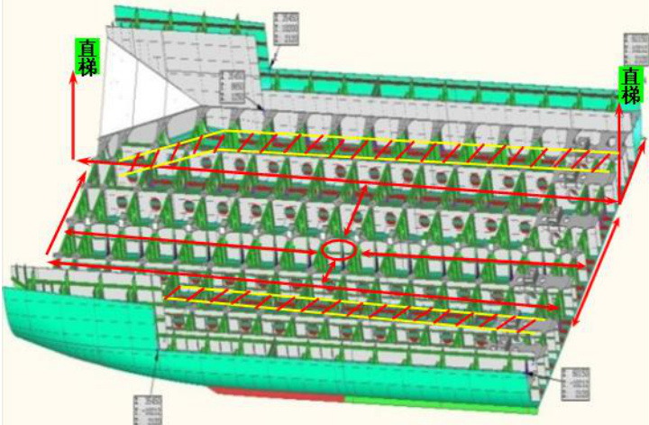罐体隔舱逃生路线的指向布置在该舱前后空舱通向甲板的直梯处,为了缩短逃生时间,增加逃生出口,船台搭载阶段可以利用底部分段的工艺孔作为临时逃生出口。底部分段纵向左右两侧的第二道是人孔洞,是纵向唯一的逃生路线,其它纵向孔均为减轻孔,尺寸太小,通过非常困难,不适合作为逃生使用。具体逃生线路设置如图 1 所示。