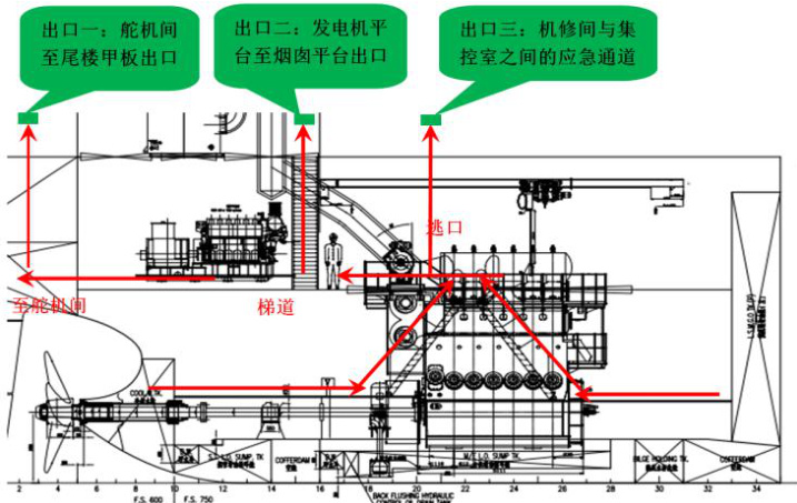 为了辅助人员撤离,机舱逃生通道也需布置合理,上下层平台要有效衔接。机舱应急逃生通道出口有三处(如图 5 所示),第一处是舵机间至尾楼甲板出口;第二处是发电机平台至烟囱平台出口;第三处是机修间与集控室之间的机舱应急逃生通道。位于机舱底层的人员分别通过主机两侧的斜梯通向机舱上层平台,然后选择三个出口迅速撤离出机舱;位于机舱平台、舵机间和集控室的人员可根据自身站位选择就近的逃生出口迅速撤离出机舱。