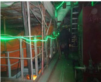 逃生路线上单独安装红色充电式12w36vLED 应急出口标记灯和36V 导向灯带(图 3),接入应急专用的 36V 隔离电源。应急指示照明灯和导向灯带的设置与逃生线路相同,导向灯带按逃生线路全覆盖设置,导向灯带铺设时,灯带发光的一面朝向地面,用扎带绑扎并留有一定余量。应急指示照明灯设置在每个拐角和出口处,利用红色光源指引逃生方向,从而使逃生者能根据自身站位选择就近的逃生出口。