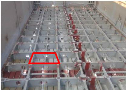 罐体隔舱被底纵桁和肋板分为一百多个肋距为 750mm 左右、中纵间距630mm 左右的约 7m3 的格栅区域(作业区)。