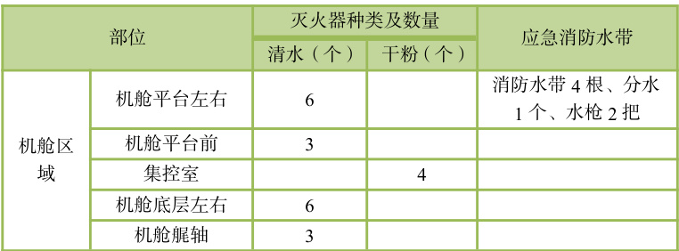 表 1 机舱区域应急消防器材配置表