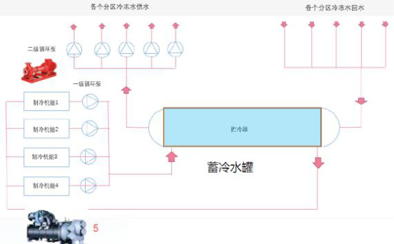 用户侧:二级泵组从蓄冷罐取冷,按商业、办公等区域分设变流量泵组,匹配末端水阻力差异( 3-7mH2O )。