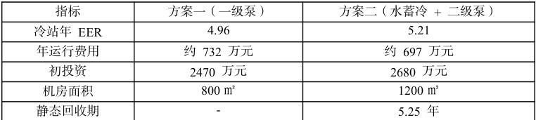 对比传统一级泵变流量系统(方案一)与水蓄冷方案(方案二)的技术经济指标: