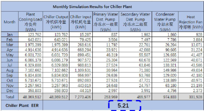 根据以上主机配置及负荷模拟,本项目采用水蓄冷+二级泵变流量系统全年EER 可做到5.21(如图 5 能耗模拟图所示)。