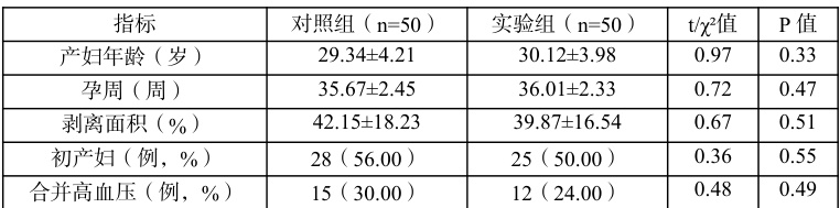 该次研究的入选患者来源于 2024 年 1 月-2025 年 1 月期间该科室中确诊且必须进行紧急剖宫产的胎盘早剥患者100 例,所有患者均属于单胎,孕周 28 周及以后。患者均排除合并严重妊娠并发症,具体包括子痫前期以及 HELLP 综合征患者,排除新生儿先天畸形者,患者不存在凝血功能障碍。采用随机数表法将患者分成2 组各 50 例,2组均排除心脑血管系统疾病史和妊娠期糖尿病患者,实验组与对照组患者年龄对比( 1=0.0451 , P=0.9613 ),孕周对比( 1=0.4367 , P=0.6633 ),胎盘剥离情况对比( 1=0.2404 ,P=0.8111 ),对比结果无意义( P>0.05 ),该次研究已通过伦理会批准,参与研究者患者知情且自愿签署同意书。