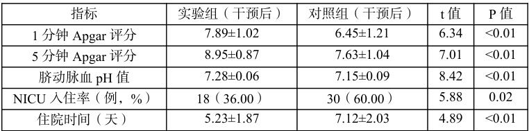 主要指标:新生儿 1 分钟、5 分钟 Apgar 评分;次要指标:脐动脉血 pH 值、新生儿窒息率(Apgar 评分 <7 分)、NICU 入住率、住院时间。窒息定义为1 分钟 Apgar 评分 ⩽7 分或需正压通气。数据由独立盲法评估员采集,避免主观偏倚。