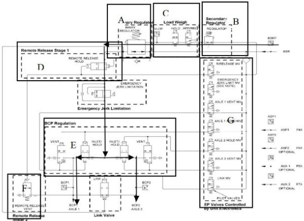 制动风缸(BSR)的压缩空气通过主风管进入 EP2002 阀,经过副调节器(B 区),副调节器通过与空气簧系统连接,将输入压力限制在紧急制动的最大压力范围内(通常为满载工况下的压力值),防止制动缸压力过高,副调节器的输出压力进入主调节器时压力调节由 “载荷称量单元(C 区)” 控制,通过空气簧系统传来的压力信号,向主调节器提供控制压力,使主调节器输出与载荷匹配的紧急制动压力。主调节器的输出压力进入制动缸压力调整器(D 区),通过电磁阀(G 区)的电控信号进一步调节压力,形成符合常用制动要求的制动缸压力(BCP)。调整后的压力通过两条独立管路分别供给转向架的两根轴(轴 1 和轴 2)的制动缸,并通过“连接阀(E 区)”实现压力的联合或隔离,如图 2.1。