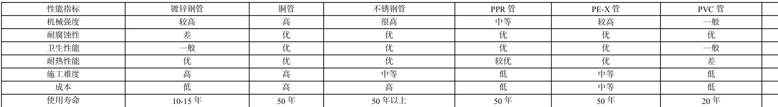 PVC 管质地坚硬,成本低廉,抗腐蚀性强,适用于排水系统或非承压给水系统。在高温环境下易变形,接头处易老化开裂,不适合用于热水管路。