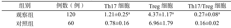 观察组 Treg 细胞含量为 4.37±1.17 ,明显低于对照组,而 Th17 细胞和 Th17/Treg 细胞均高于对照组,差异均有统计学意义( P<0.05 )(表 1)。