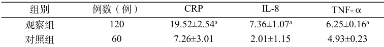 2.2 两组患者炎症因子含量比较观察组 CRP、IL-8 和 TNF- α 含量分别为 19.52±2.54 、7.36±1.07、 6.25±0.16 ,均明显高于对照组,差异有统计学意义( P<0.05 )(表 2)。