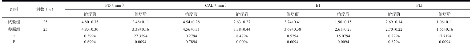 选取我院 2024 年1 月至 2025 年 6 月期间收治的慢性牙周炎患者共 50 例作为研究对象,均符合《国际牙周炎分类标准》的诊断标准。按照随机数字表法将患者分入试验组和参照组,每组各25 例。试验组患者年龄范围为32-61 岁,平均年龄为(46.29±7.34)岁;参照组患者年龄范围为 31-62 岁,平均年龄为(46.45±7.19) Y 。