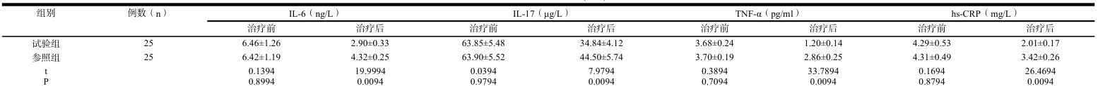 试验组患者在治疗后龈沟液中炎症因子水平(IL6、IL17、TNFα以及 hsCRP)均显著低于参照组,差异具有统计学意义