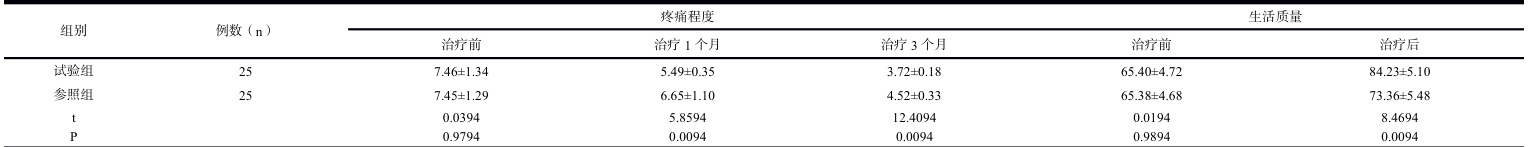 比较两组患者医治之前与之后的疼痛程度及生活质量评分。疼痛程度评分使用疼痛数字评分法 NRS,区间为 0-10 分,分数越大象征患者的疼痛越剧烈。测评医治后短时间 1 个月及中段时间 3 个月疼痛评分,并登记患者医治前的初始评分。生活质量评分使用问卷调查数值化估量,以 1~100 分展示得分区间,得分越大显示患者生活称心度越佳。从评测数值变化推断两组患者医治后疼痛减轻情况及生活质量提升程度。