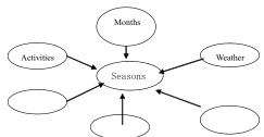 词汇是语言的建筑材料。用头脑风暴、猜谜、语意图等形式复习词汇。如话题 Seasons复习课中,先让学生根据单词后缀-y 等复习所学词汇:windy、cloudy、sunny、rainy 等。再通过 “Seasons”这个话题作导引,设置了一个话题map 图:
