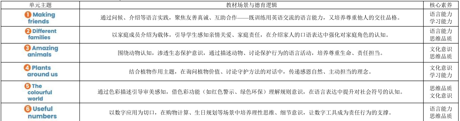 人教版PEP三年级英语上册教材以生活场景为线索,6个单元暗藏清晰的德育逻辑,可对应核心素养四大维度:
