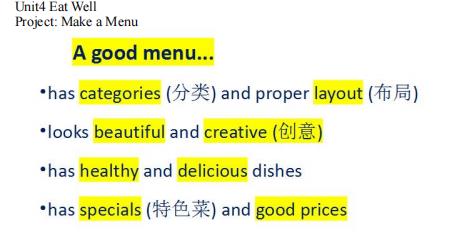 通过设计、评价和使用餐厅菜单,进一步理解健康饮食的概念,提升语言运用能力以及与他人合作交流的能力。