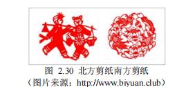 瑞昌剪纸,因其工艺离不开剪刀,又被人们誉为“刀尖上的舞蹈”。剪纸艺 人在作品中宣泄了自己的情感,将创作过程变成一种心灵美好的享受过程,因此 不论是用剪刀或是刻刀制作出的造型都显得简朴大方,那些没有功利心不受约束 制作出来的图形,让剪纸图样生动质朴、灵动自然。刀,是剪纸艺人的“武 器 ”,所有的剪纸纹样与结构都离不开刀法的变幻;纸,是剪纸艺人的“ 战 场 ”,在不断练习与学习技法之后,种种精美的纹样就会跃然纸上。在常见的剪 法中都会分为阴阳剪法,阴剪多为块状,清晰简约,图案整体看起来大气又不失 细节;而阳剪的刀法使用中会使线线相连,衔接紧凑、自然灵动有一定的完整 性。瑞昌的剪纸在风格形式上似与南北方剪纸相同(图 2.30),细看下来却又有不同之处。
