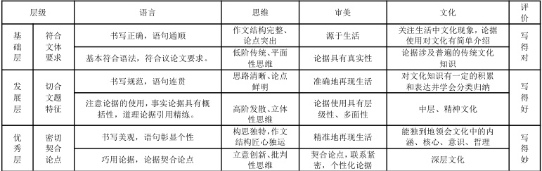 新课标明确指出语文的核心素养包括以下几个方面:文化自信、语言运用、思维能力、审美创造。“语言文字及作品是重要的审美对象,语言学习与运用也是培养审美能力和提高审美品味的重要途径。语言文字既是文化的载体,又是文化的重要组成部分,学习语言文字的过程也是学生文化积淀与发展的过程。在语文课程中,学生的思维能力、审美创造、文化自信都以语言运用为基础,并在学生个体语言经验发展中得以实现”。“课程评价应准确反映学生的语文学习水平和学习状况,注重考察学生的语言文字运用能力、思维过程、审美情趣和价值立场,关注学生学习过程和学习进步。”据此,我们针对这节课设计了基于语文核心素养的“三维四阶”的初中写作评价简表,供大家参考。