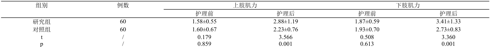 护理前两组肌力分级差异无意义( P>0.05 ),护理后研究组优于对照组( ⋅P<0.05) )。见表 1。