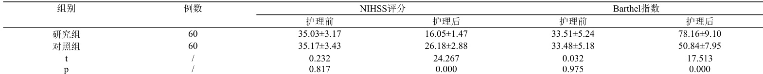 护理前两组NIHSS评分、Barthel评分差异无意义 (P>0.05 ),护理后研究组优于对照组( (P<0.05) )。见表 2。