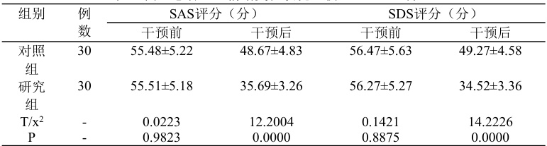 护理干预前,两组患者SAS、SDS评分对比不具差异性, P>0.05 ,护理干预后研究组患者SAS、SDS评分均分别低于对照组, P < 0 . 0 5 。见表 1。