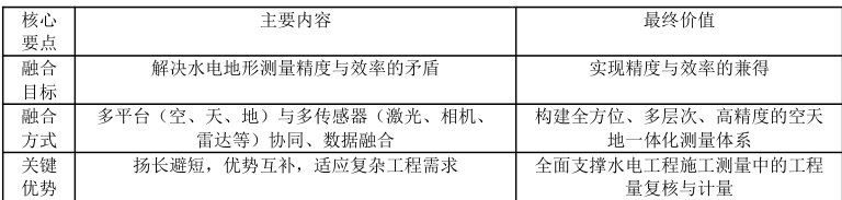 事实上,多源数据融合的思路远不止于无人机摄影测量和地面激光扫描的组合。随着测绘技术的不断进步,多平台、多传感器的协同测量日益成为常态。在空间维度上,既有高空卫星遥感、航空摄影测量等上天入地的数据获取手段,也有车载移动测量系统、背包式扫描系统等灵活机动的地面作业方式。不同平台的环境适应性各有千秋,可根据工程实际需求和现场情况进行灵活选配,扬长避短。而在传感器方面,可见光相机、多光谱相机、合成孔径雷达、激光雷达等更是百花齐放,不同传感器所获取数据的特性迥异,可满足高分辨率影像、高精度三维点云、地表参数反演等多元化的数据需求[2]。将多平台、多传感器的数据进行融合处理,便可构建全方位、多层次、高精度的测量数据体系,全面支撑水电工程施工过程中的工程量计量与复核工作。见表1: