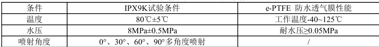 但从表一可知,IPX9K 标准对应的高温高压喷水环境对防水透气膜的耐水压性能提出了严苛挑战。根据《膨体聚四氟乙烯防水透气材料提高电子零部件的可靠性》及戈尔技术文档,现有 e-PTFE 膜的透水压性能常规耐水压为0.05MPa,部分高透气性能产品能达到0.1MPa,但与 IPX9K 环境的压力需求存在数量级上的显著差距,可能因水压过载导致膜结构破损或微孔扩张,丧失防护功能。