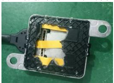 未优化结构的原始塑料盖板样品在进行IPX9K 防护等级试验后,氮氧传感器无法正常通讯,拆解后发现SCU 电路板进水烧蚀,如图四所示防水透气膜内侧还残留着高压水枪渗入的水珠。