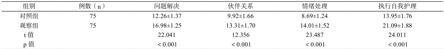 (1)自我管理能力:采用自我管理能力量表对患者进行评估,其中包括问题解决(5\~20 分)、伙伴关系(4\~16 分)、情绪处理(4\~16 分)及执行自我护理(7\~28 分)等四方面,得分越高,则代表患者自我管理能力越强。