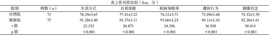 (2)依从性:包括生活方式、自我效能、疾病知晓率、遵医行为及健康信念等方面,各方面分值 0\~100 分,本量表为我科自制量表,邀请领域内专家对信效度进行评价,可信度较高。