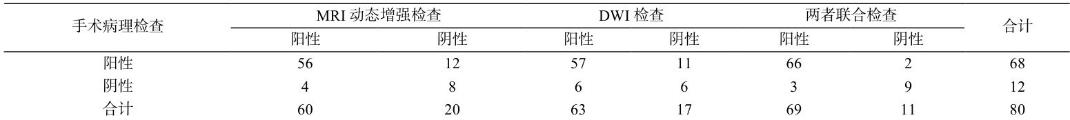 由此可见,MRI动态增强联合DWI检查的灵敏度、特异度、准确度均高于MRI动态增强与DWI检查的单一检查结果。见表 1。