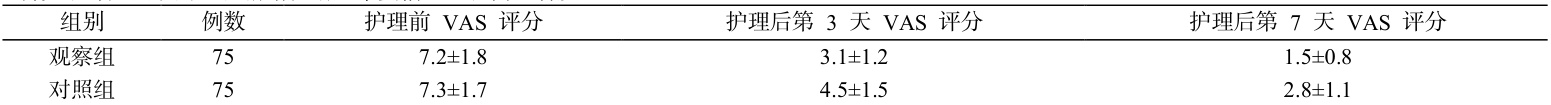 护理前,两组患者 VAS 评分无显著差异( P>0.05 ),具有可比性。护理后第 3 天,观察组 VAS 评分为( 3.1±1.2 )分,对照组为( 4.5±1.5. )分;护理后第 7 天,观察组 VAS 评分为( 1.5±0.8 )分,对照组为( 2.8±1.1 )分。经独立样本 t 检验,护理后第 3 天和第 7 天,观察组 VAS 评分均显著低于对照组( P<0.05 ),说明中医护理技术能有效减轻创伤患者疼痛程度。见表 2