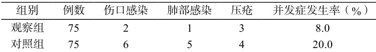 观察组并发症发生率为 8.0% (6/75),其中伤口感染 2 例、肺部感染1 例、压疮 3 例;对照组并发症发生率为 20.0% (15/75),其中伤口感染6 例、肺部感染 5 例、压疮 4 例。经卡方( ⋅x2 )检验,观察组并发症发生率显著低于对照组( χ2=4.714 , ΔP<0.05 ),证明中医护理技术在预防创伤患者并发症方面具有显著优势。见表 3