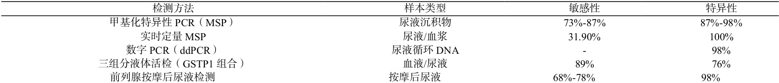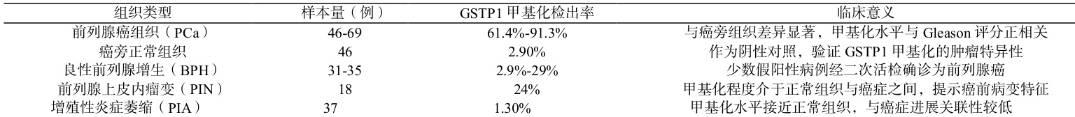 试验方法采用甲基化特异性PCR(MSP)或焦磷酸测序技术检测 GSTP1 基因启动子区甲基化状态。标本来源包括:经前列腺穿刺活检或根治性手术获取的前列腺癌组织(PCa)及癌旁正常组织(距离肿瘤边缘 >2cm );经尿道切除术或穿刺获得的良性前列腺增生(BPH)组织;通过系统穿刺活检收集的前列腺上皮内瘤变(PIN)和增殖性炎症萎缩(PIA)标本。所有样本均经病理确诊并分级。