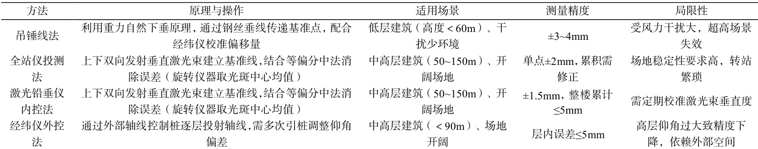 2.精度要求与核心差异。规范标准,单层误差:光学经纬仪等传统方法需控制在 ⋅±3mm 以内 8;激光铅垂仪可实现 ±1.5mm 高精度。累积误差:全高偏差需满足 H/1000 且 ≤30mm ,激光铅垂仪内控法可显著压缩至 ≤5mm 。技术差异,