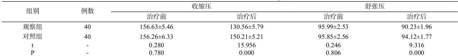 治疗前两组观测指标水平相近且均偏高( P>0.05 );治疗后观察组血压参数均更低于对照组( P<0.05 )。由表 1 所示。