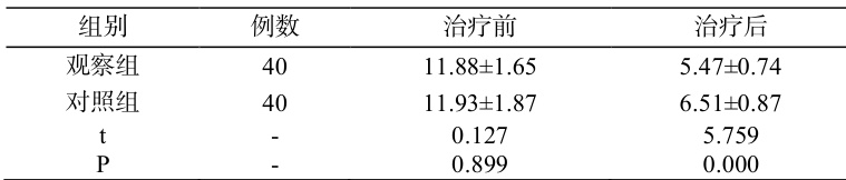 治疗前,两组睡眠质量评分差异较小( P>0.05 );治疗后观察组评分更低( P<0.05 )。由表 2 所示。