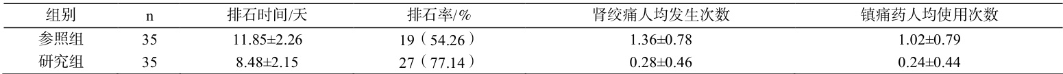 分析观察两组在结石排出时间、结石排出率、肾绞痛发作次数、镇痛药物使用次数、药物不良反应发生率方面的差异表现。