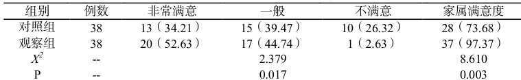 家属满意度为 97.37% (37/38),比 81.58% (28/38)(对照)高( P<0.05 )。见表