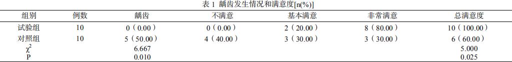 对比 1 年后龋齿发生情况;自制问卷形式对满意度进行调查和对比,总分 100 分,3 维度,均依据分数进行统计,非常满意(86\~100 分)、不满意( <60 分)、基本满意(60\~85 分),总满意度