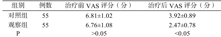 治疗前两组VAS评分对比差异无统计学意义( P>0.05 )。治疗后观察组VAS评分显著低于对照组( P<0.05 )。见表 1。