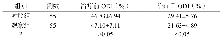 治疗前两组ODI评分对比差异无统计学意义( P>0.05 )。治疗后观察组ODI评分显著低于对照组( P<0.05 )。见表 2。