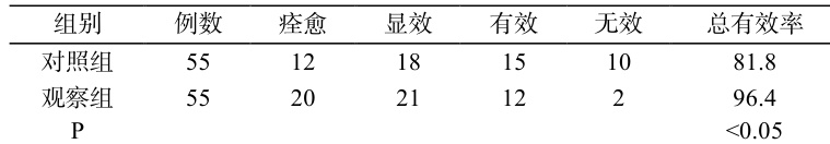 根据临床症状改善程度分为 4 级:痊愈:症状完全消失,活动功能正常,积分改善 290% ;显效:症状明显缓解,活动功能改善,积分改善 60% ~89% ;有效:症状减轻,日常功能改善,积分改善 30%~59% ;无效:症状无明显改善或加重,积分改善 <30% 。总有效率 O= (痊愈 + 显效 + 有效)/总例数 ×100% 。