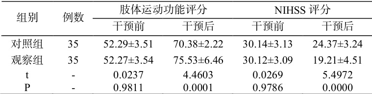 如表 1 所示:观察组在干预后肢体运动功能改善,神经损伤恢复,比较P <0.05 。