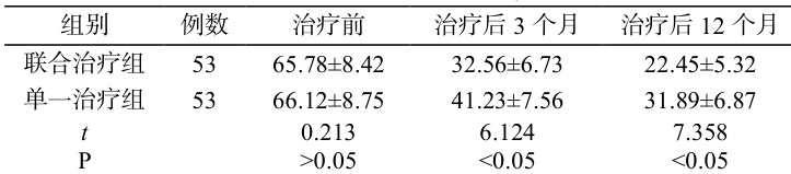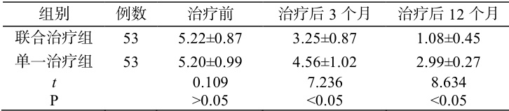 治疗后 3、12 个月,联合治疗组 VAS 评分显著低于单一治疗组( P<0.05 )。见表 1。