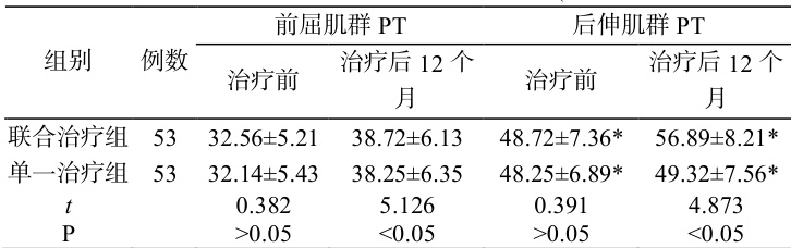 治疗后 12 个月,联合治疗组核心肌群肌力指标值显著优于单一治疗组( P<0.05)⋅ζ 。见表 3。