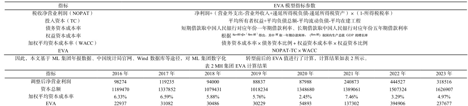 MH 集团从 2016 年到 2023 年的 EVA 值显示了数字化转型带来的经济效益。尤其是在 2021 年和2022 年 EVA 显著增长,分别达到 137302 万元和 394906 万元。在数字化转型初期,MH 集团的 EVA增长波动较小,但 2019 年后随着财务管理系统和数据分析工具的引入,资本管理效率提高,运营成本降低,运营效率提升。此外,数字化转型帮助集团洞察市场需求,实现精准营销,扩大市场份额。尽管 2023 年 EVA 有所下降,但仍高于转型初期。而其中库存周转率的加快以及生产效率的提高,使得资本使用效率提升,一定程度上影响了资本总额的合理配置,而公司整体价值创造能力的增强,正是 EVA 显著增长的根本原因。通过数字化转型,MH 集团在提升运营效率、降低成本、提高产品竞争力等方面取得了实质性进展,为公司在市场竞争中赢得了优势,也为未来持续发展奠定了坚实基础。