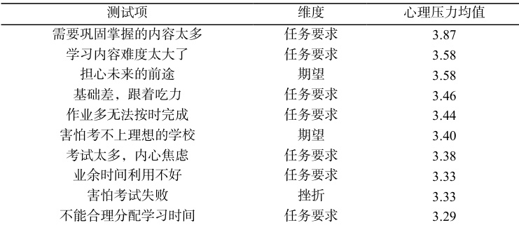 表 3-2 高三学生主要心理压力源(压力分值前十)