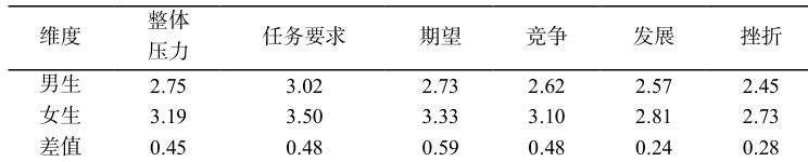 高三女生的整体心理压力和各维度心理压力均高于男生。不同性别的压力差值中,期望压力的差值(0.59)最为显著,发展和挫折压力的差值则较小。这为针对不同性别采取差异化的心理素质提升措施提供了依据。