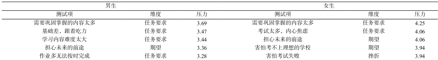 进一步截取男女生压力值最高的 5 项压力源,见表 3-4。存在 2 个显著差异:(1)女生群体压力值显著高于男生;(2)男生前 5 大压力来源中 80% 来自任务要求压力,女生则分别来自任务要求、期望和挫折压力。这表明女生的压力程度更高且来源更为广泛。